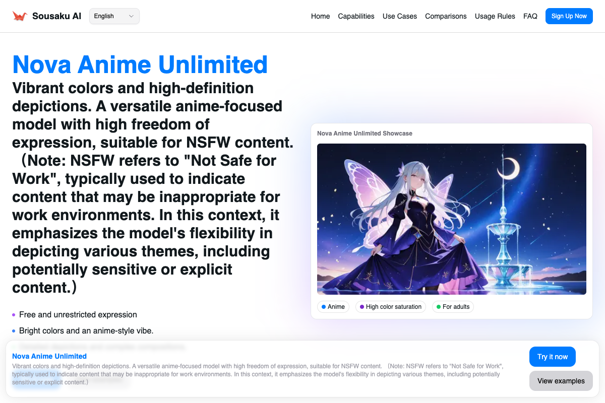 Nova Anime Unlimited offers exceptional capabilities for generating rich, detailed anime-style visuals. When applied to Environment Concept Art, this text-to-image model provides creators with immense freedom in composition and detail density. You can directly access and utilize this model within the Hotgen.AI platform to streamline your creative workflow and build immersive worlds.