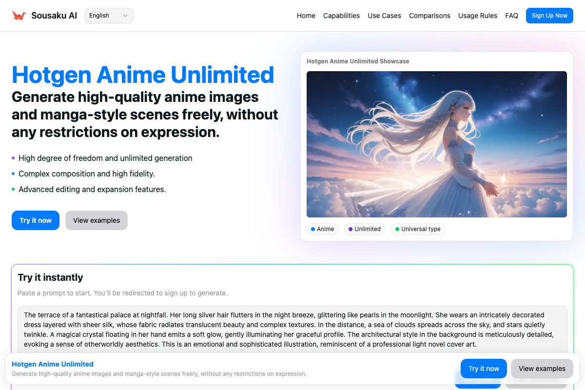Creating high-fidelity anime characters and complex doujinshi illustrations requires an AI model that understands intricate stylistic nuances without imposing rigid content filters. Hotgen Anime Unlimited addresses this specific demand by offering an unrestricted generation engine tailored for professional anime aesthetics, handling everything from standard daily life scenes to niche sub-genres.