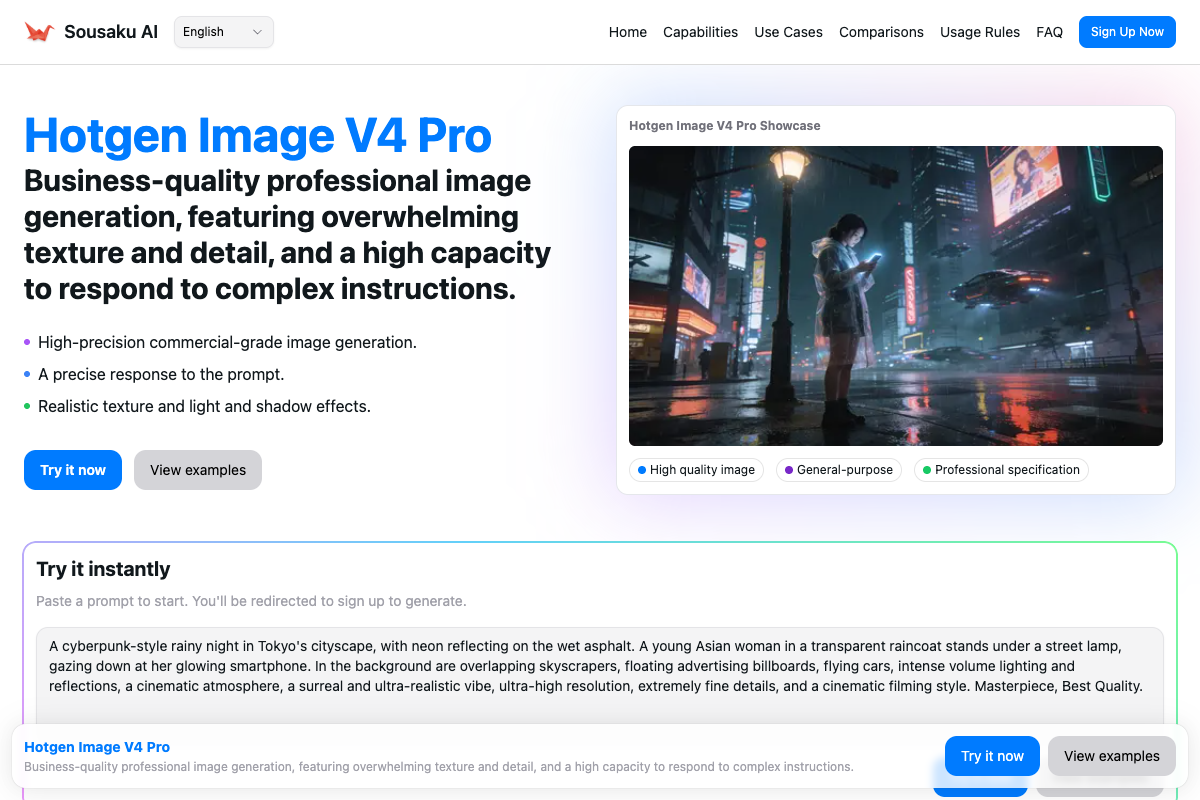 Hotgen Image V4 Pro provides the necessary resolution, material realism, and prompt adherence required for professional-grade visual assets. Its strengths align directly with the demands of commercial photography and intricate character rendering.