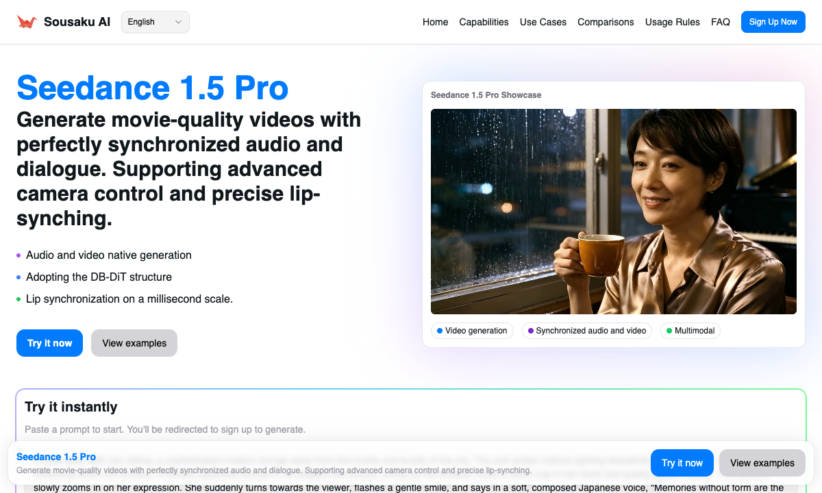Seedance 1.5 Pro addresses these precise requirements by generating synchronized video and audio within a single latent space. It handles complex cinematic elements—from precise lip-syncing to specific camera movements—directly from text or image inputs.