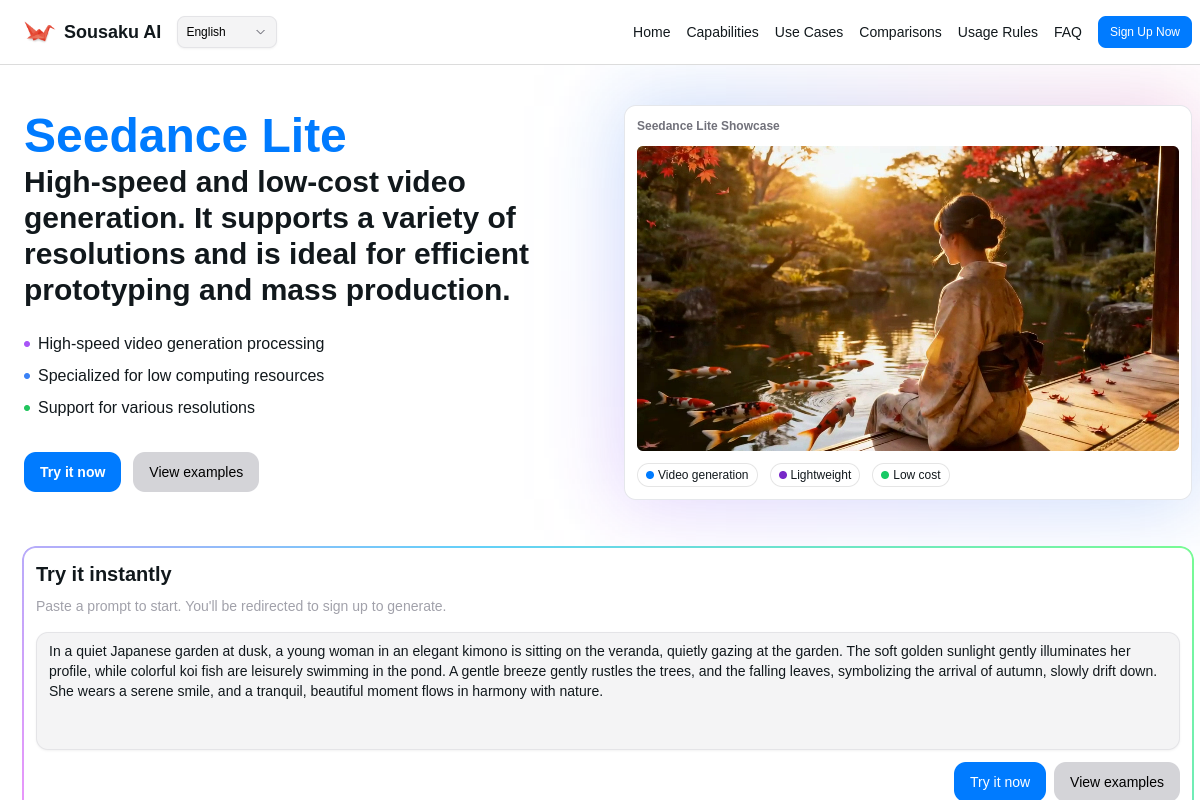 Sousaku.AI integrates Seedance Lite into a unified creative environment, allowing you to switch seamlessly between text and image inputs.